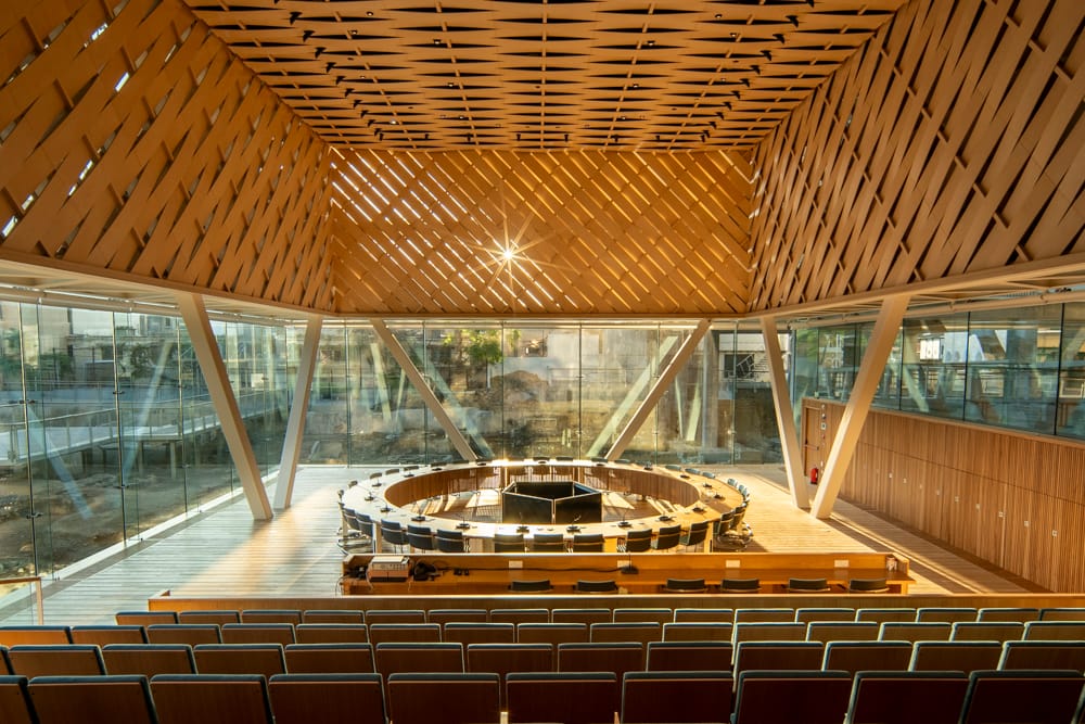 The design acts as a transparent civic interface. Glass façades are not aesthetic decoration — they represent institutional openness. At night, the building glows softly, often described as a “magic lantern” within the historic fabric.