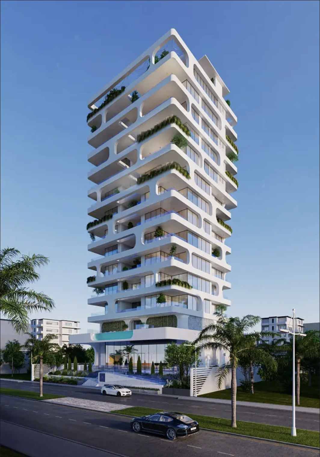 Shaped like a sail, Arc Ship rises 17 floors near the sea in Mouttagiaka-Amathunta. With smart systems, photovoltaic panels, and refined soundproofing, it merges futuristic design with comfort. A spa, catering service, and children’s play area make it ideal for families and professionals alike.